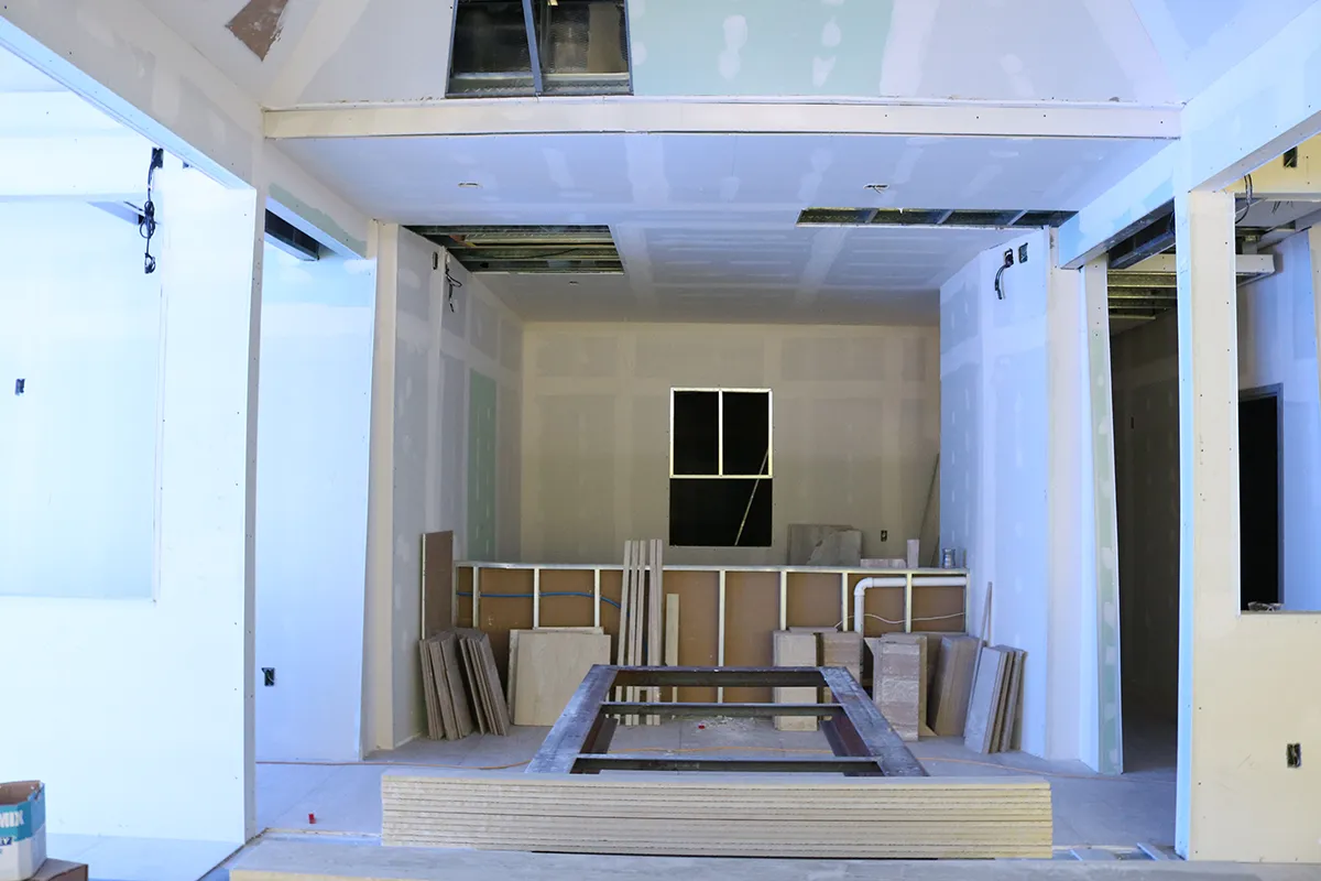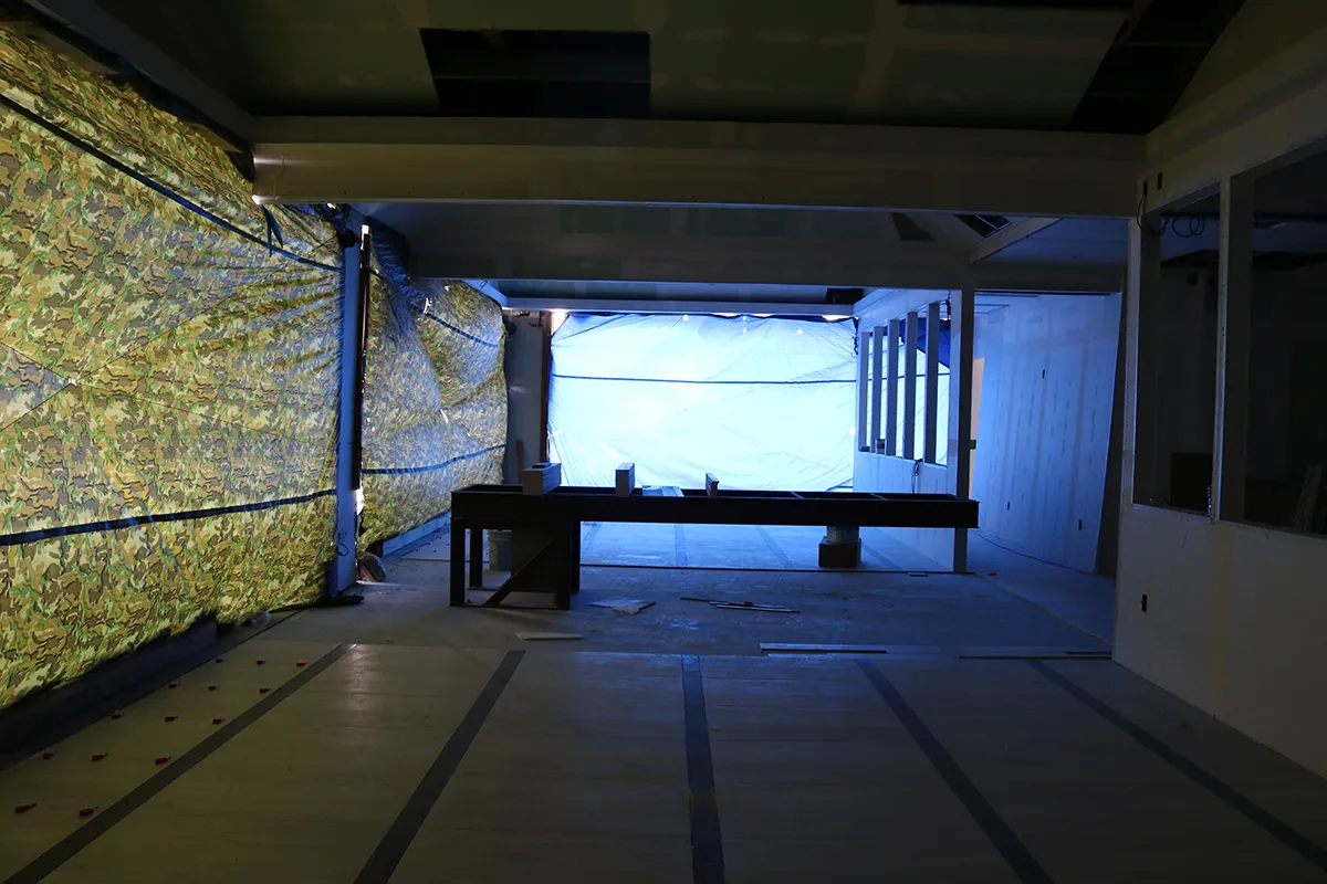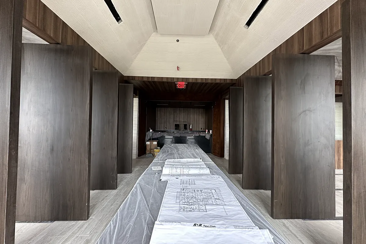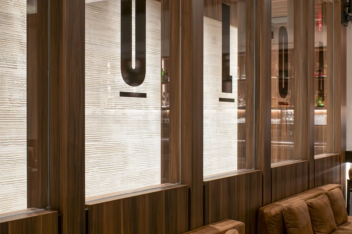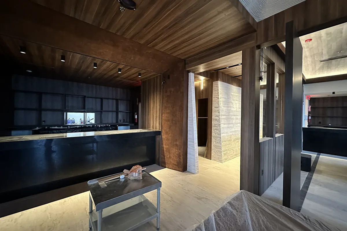 The interior features a sleek, intimate dining area highlighted by wood finishes, ambient lighting, and clean architectural lines, creating a sophisticated setting for small gatherings and premium service. Floor-to-ceiling glass seamlessly connects the indoor space with the rooftop terrace, allowing guests to transition effortlessly between environments.