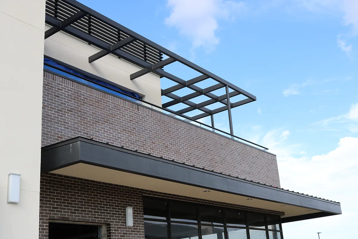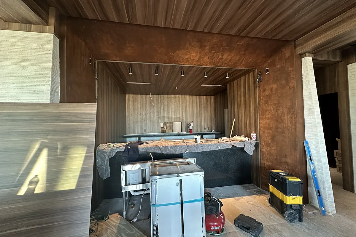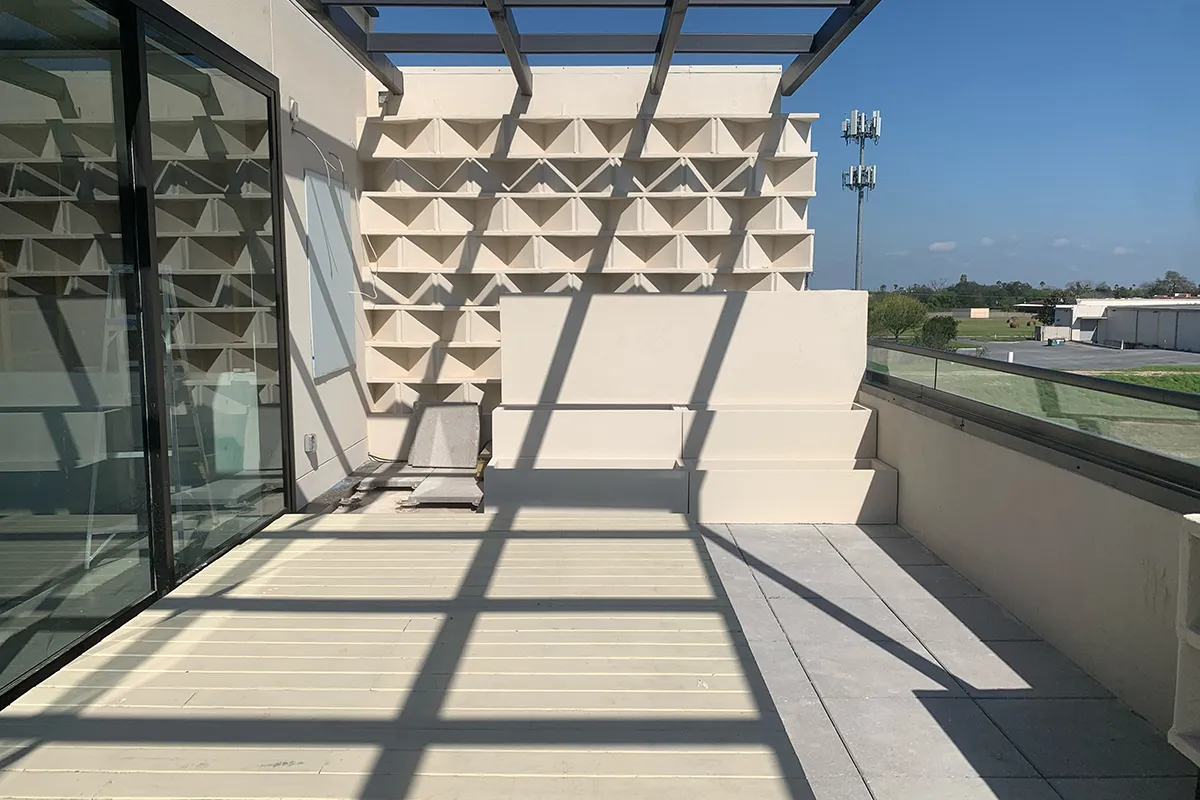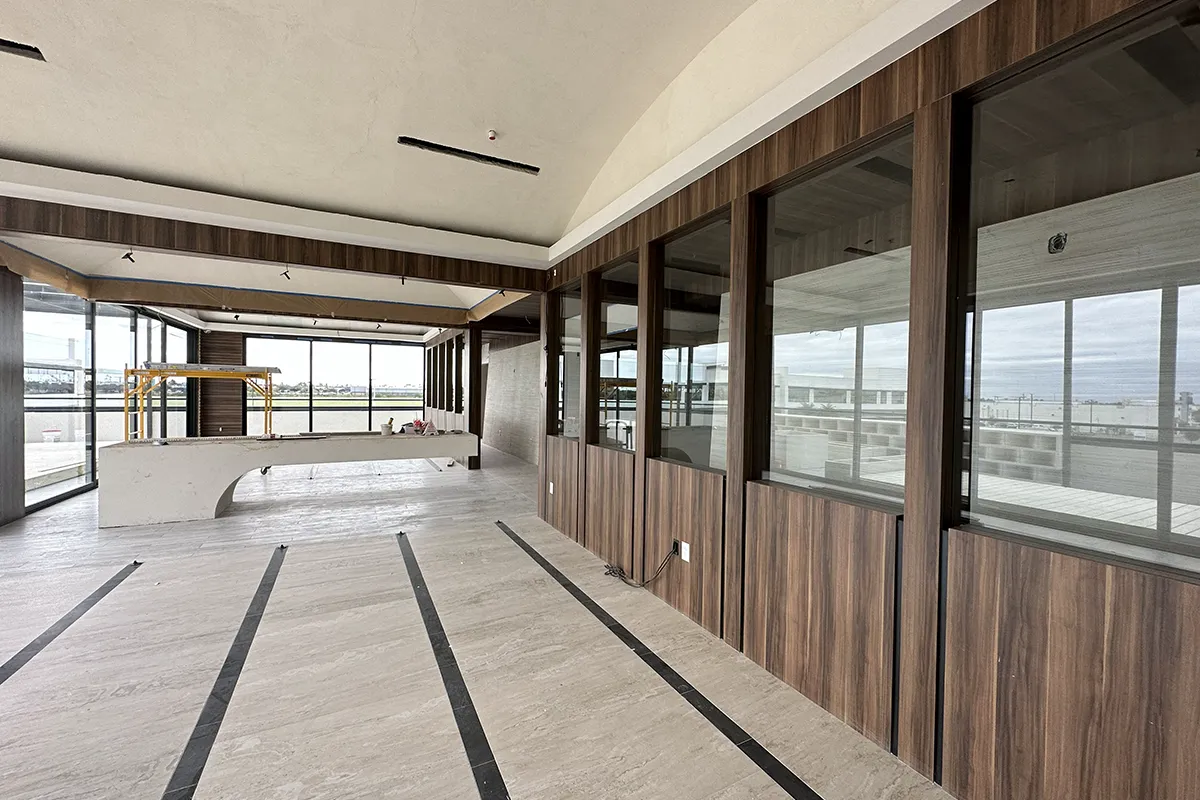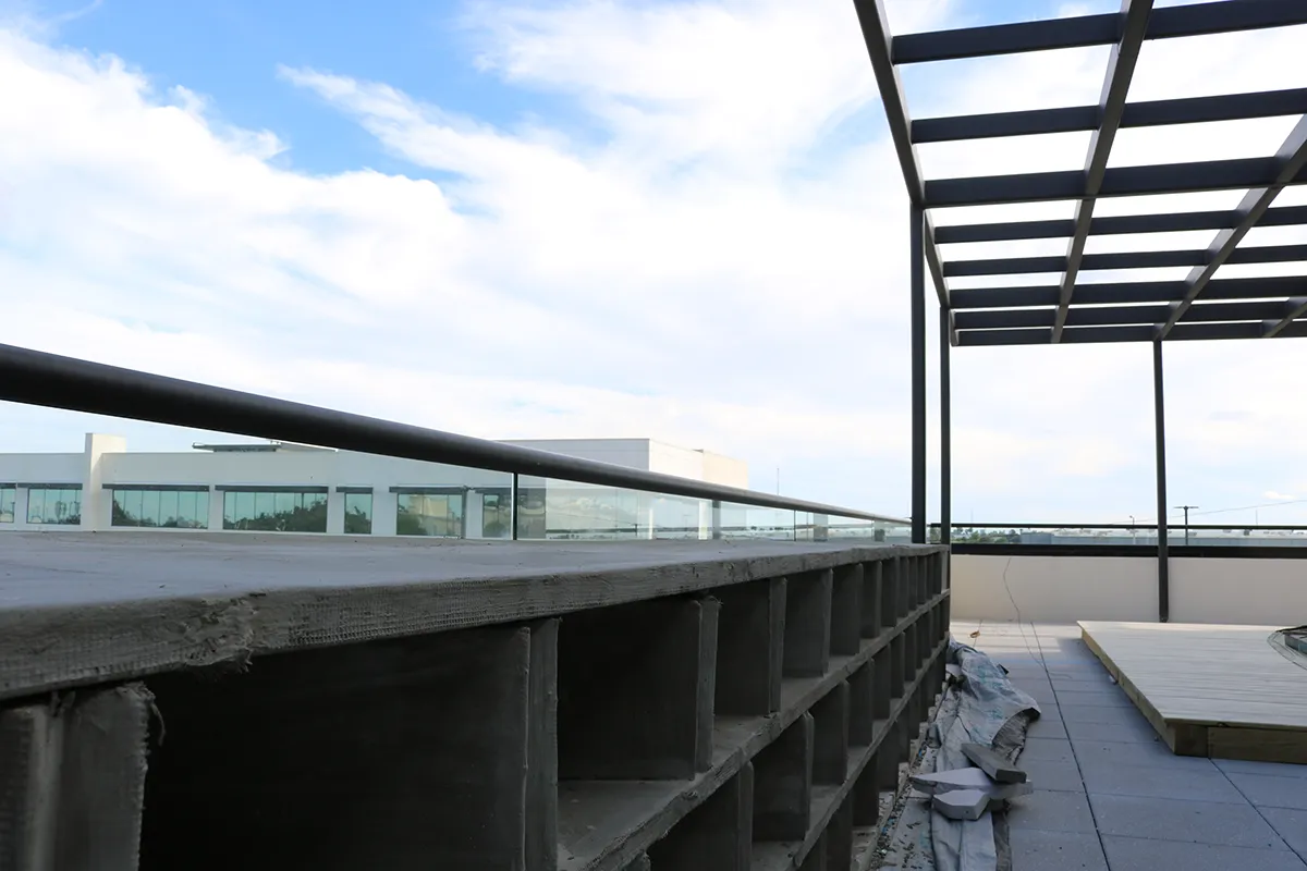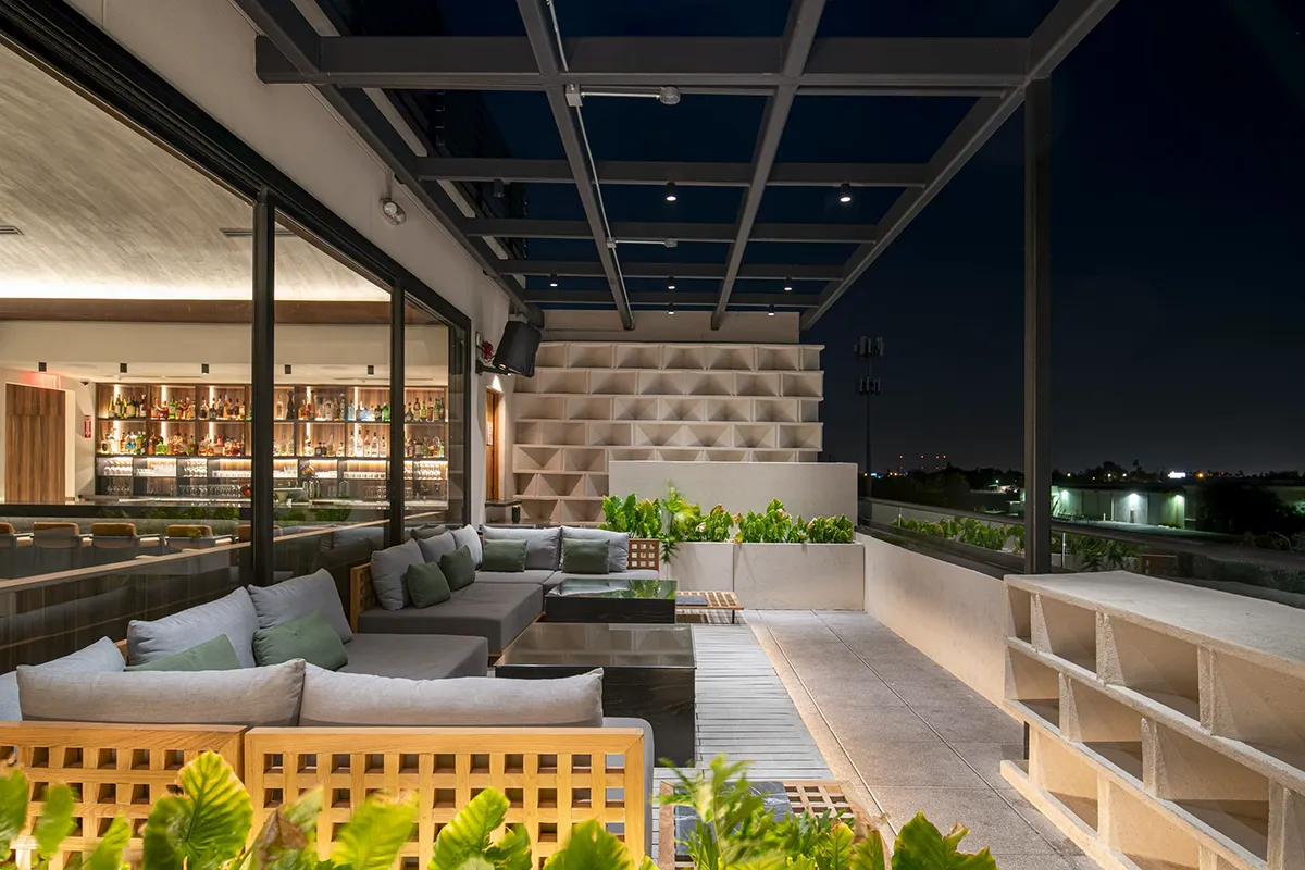 Outdoors, the rooftop lounge delivers a relaxed yet upscale ambiance, complete with comfortable seating, modern pergola structures, and carefully integrated greenery. The open-air design offers panoramic views, making it an ideal setting for evening cocktails, social events, or private gatherings under the night sky.