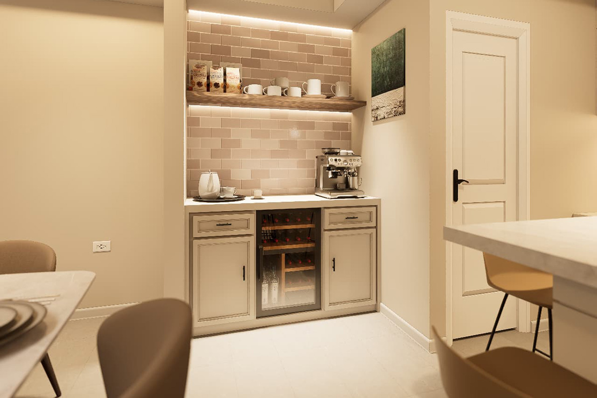 - Dedicated coffee/bar station with built-in storage and wine cooler